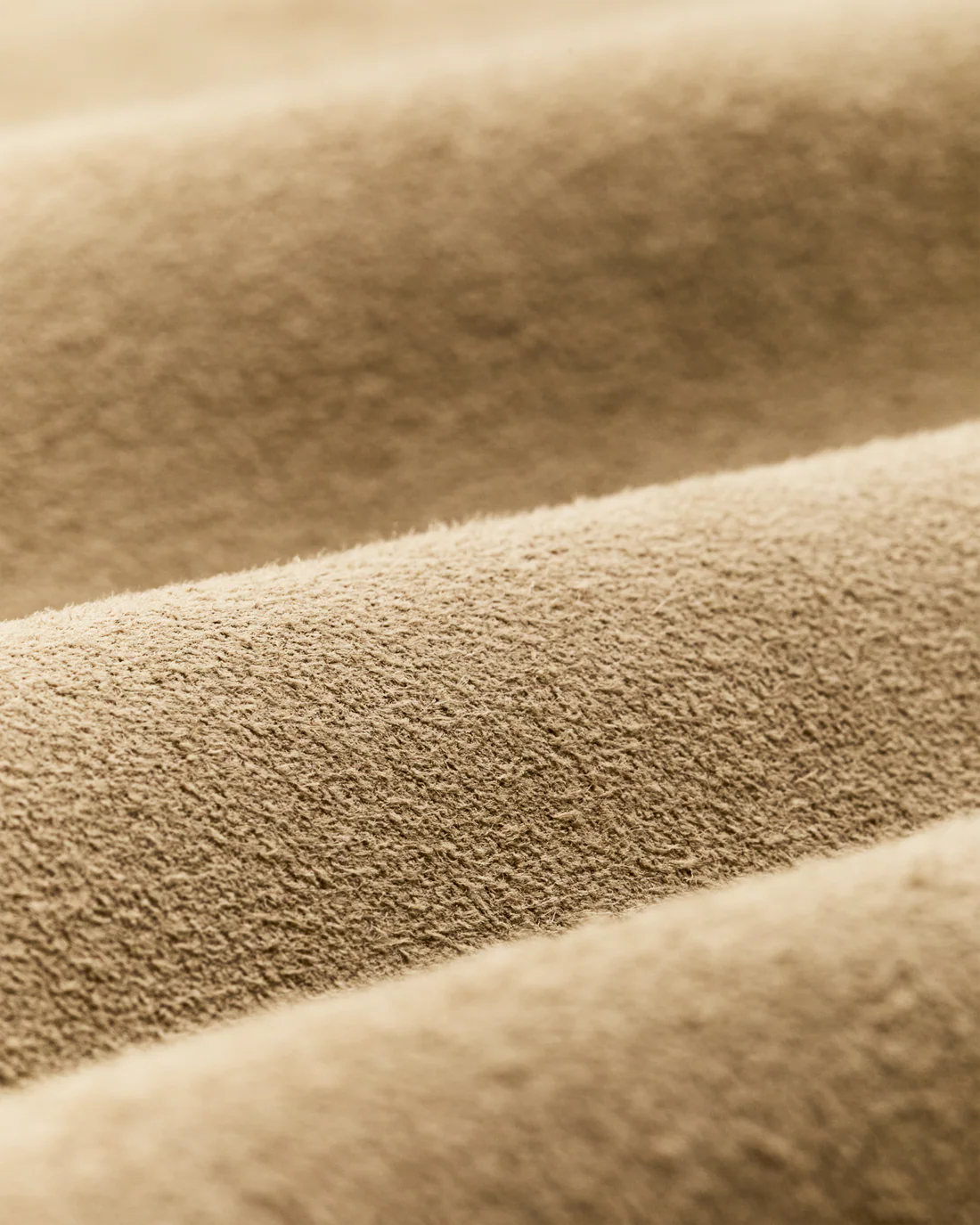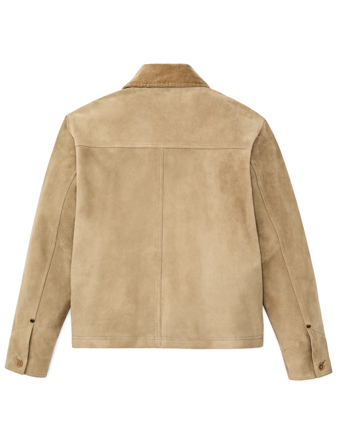 This Short Suede Barn Jacket combines rugged utility with elevated material. Cut from strong goatskin leather that's been sueded for a soft hand and matte finish, it brings a touch of refinement to a hardworking silhouette. The leather is naturally durable yet supple, built to withstand years of wear while developing a patina that's uniquely yours.